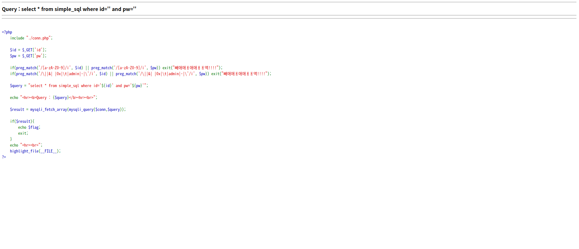 if(preg_match('/\||&| |0x|\t|admin|-|\'/i', $id) || preg_match('/\||&| |0x|\t|admin|-|\'/i', $pw)) exit("빼애애ㅐ애애ㅐㅐ액!!!!");