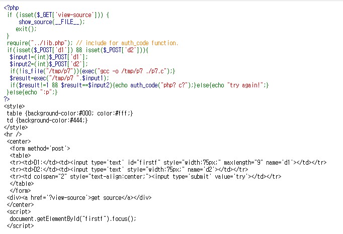 D1에는 결과가 1이 아닌 값, D2에는 결과 값을 입력 해야 플래그를 얻을 수 있습니다. 또한 그 연산은 p7.c로 하는 것을 확인 할 수 있었습니다.